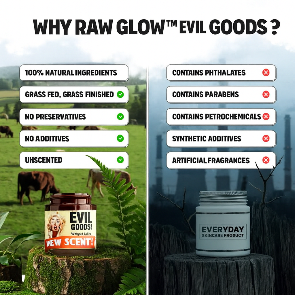 We stripped skincare back to what actually works — real, raw ingredients your skin understands. While big brands hide behind chemicals and synthetic fillers, Raw Glow™ keeps it brutally simple: grass-fed beef tallow, Manuka honey, and pure botanicals. No parabens. No petrochemicals. No fake fragrances. Just results.